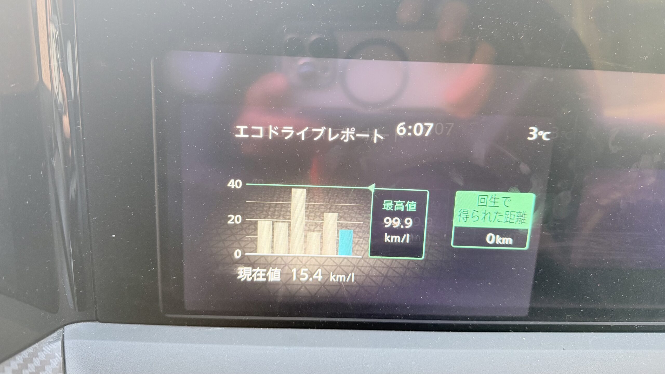最高値は私がとある山道を超えた時の燃費です。数値がカンストしていますが、山道では上り坂で多くの燃料を消費するものの、下り坂では回生ブレーキでタイヤの回転を電力として回収しますので、このように効率よく走ることができます。