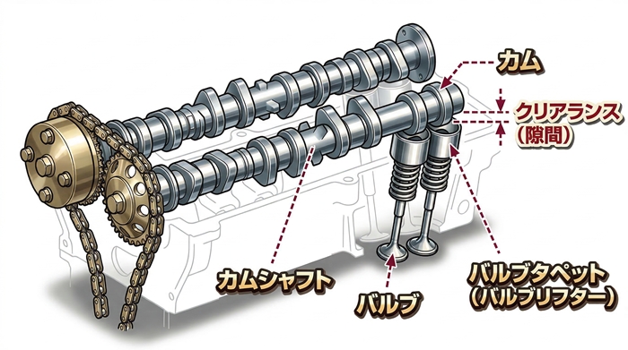 オイルが劣化して潤滑性能が落ちると、金属同士の直接的な接触が増えて摩耗を加速させます。また、油圧で隙間を自動調整する「ラッシュアジャスター」を搭載している車の場合、オイルの汚れ(スラッジ)が内部に詰まって正常に作動しなくなると、一気に大きな音が出始めます。