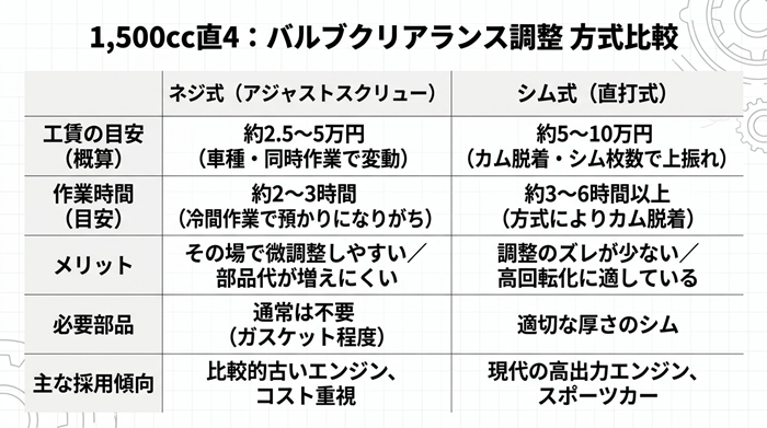 例として、一般的な国産1,500ccクラスの4気筒エンジンにおけるバルブクリアランス(タペット)調整の費用は、概ね30,000~70,000円前後が相場です。