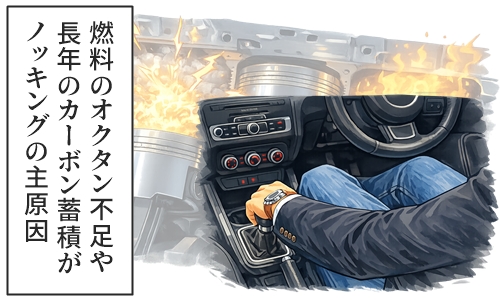 原因として多いのは、ハイオク指定エンジンなのにレギュラーガソリンを入れている場合や、長年の運転方法による、エンジン内部へのカーボンの蓄積、それ以外には点火系の制御異常や燃料系トラブルなどもあります。