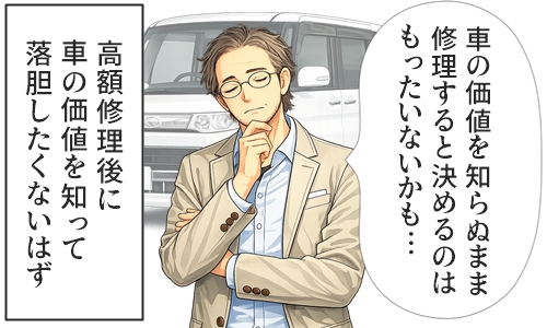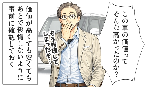 本当に修理に値する車なのか、意外と値段がついて高い車なのか、年式や走行距離も考えてみて、乗り換えたほうがいいのか修理したほうがいいのかを確認する。