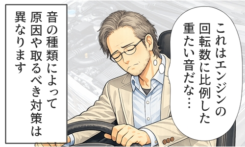 回転数に比例して音が大きくなる、またはエンジン内部から「重い打刻音」が規則的にカラカラと鳴る場合、エンジン内部からの異音である可能性が高いです。