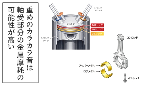 その他タイミングチェーンなどが挙げられ、これらはエンジン内部の金属部品が摩耗して隙間が生じることで、回転に合わせて金属同士が当たり、規則的な異音として現れます。
