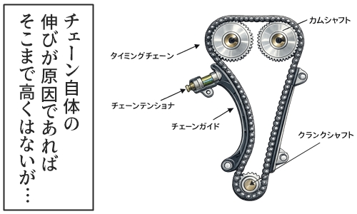 原因としては、チェーンやエンジンの設計、テンショナー構造、走行距離、そしてオイルの状態などと言われ、さらに最近の直噴エンジンにおいては、オイル劣化の影響を受けやすくなっている傾向があるようです。