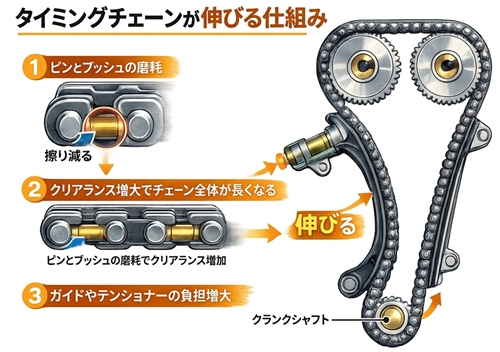 タイミングチェーンのトラブルは、単純に「チェーンが伸びた」というよりも、チェーン内部のピンやブッシュ(ピン接合部)の摩耗が積み重なり、結果として全体が長くなってしまう現象です。