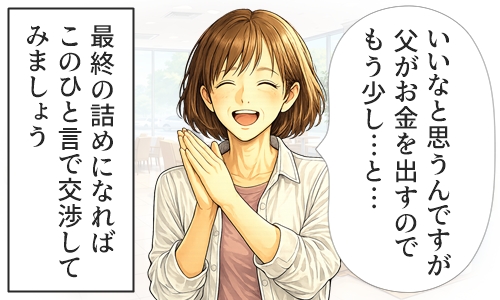 あと一歩の値引きを引き出すために、若い方や女性の方であれば親御さん、男性であれば奥様など、あくまで架空の人物で良いので、決定権のある人物の存在を匂わせてみましょう。