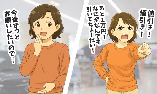 車は購入してから付き合いが始まるもの。点検や保証、保険など、何かにつけてやり取りする機会は増えるので、値引き値引き!とガンガンまくしたてるのか、柔らかく話してそこそこに切り上げるのか。